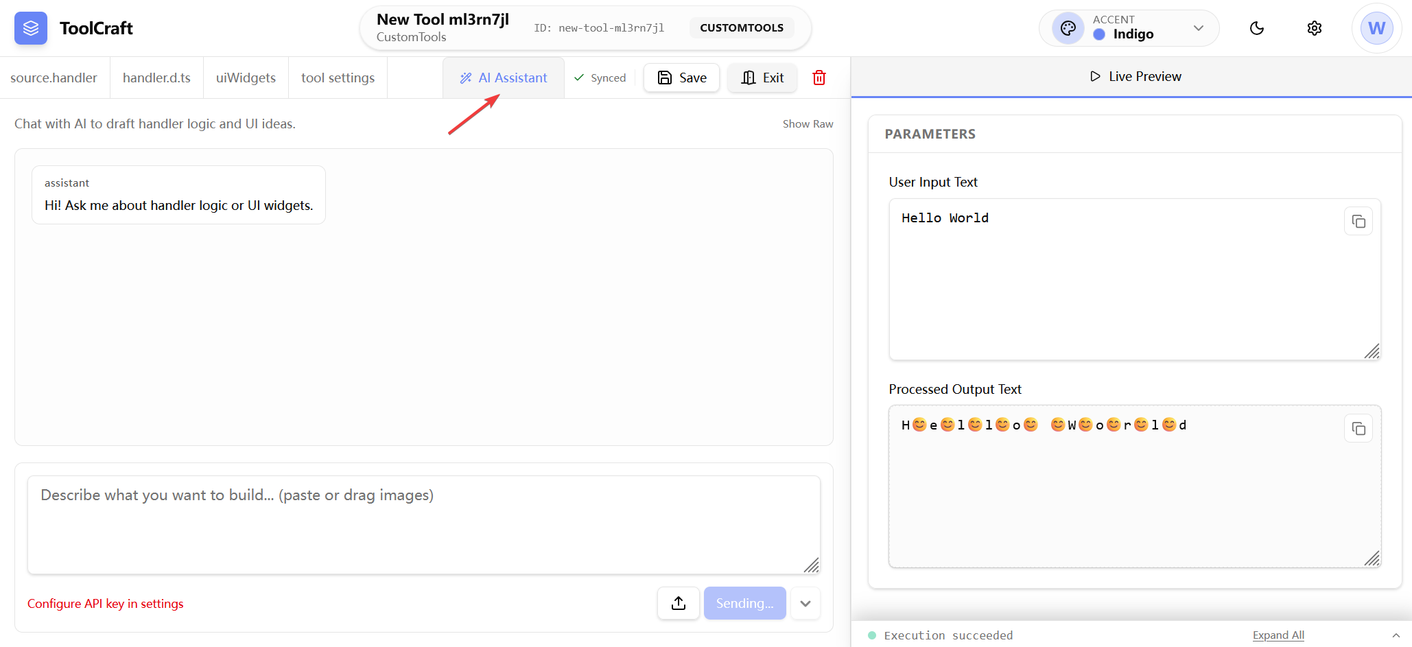 Creating tools can be a tedious process. You need to define the uiWidgets JSON and handler function code, then repeatedly modify and debug until you achieve the desired functionality.