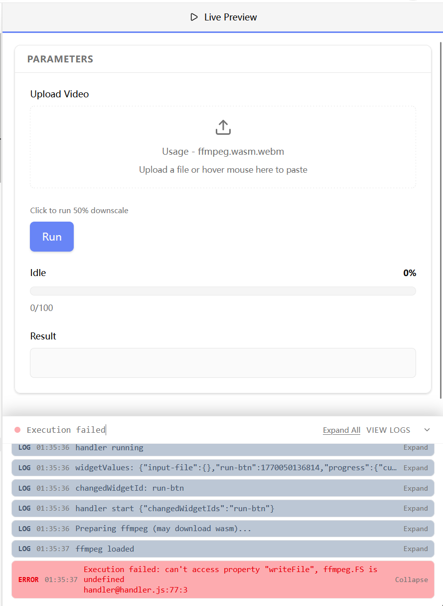 When a handler error occurs, the LogPanel at the bottom of the tool interface will show an execution failure. Click on the LogPanel to view the error details. Copy the error message into the input box and ask the LLM to fix the error.