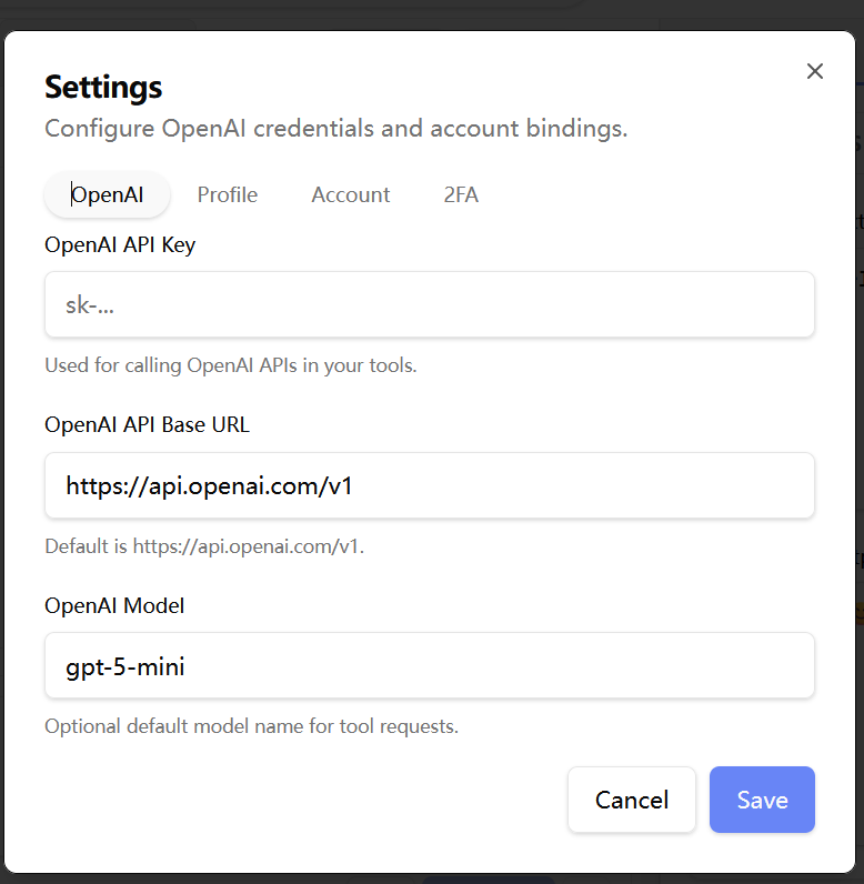 Before you start using the AI Assistant panel, you need to configure your OpenAI API Key, API URL, and Model information.